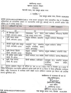 कोरबा। सामान्य प्रशासन विभाग ने राज्य प्रशासनिक सेवा के 6 अधिकारियों का तबादला आदेश जारी किया गया है। जारी आदेश में जगदलपुर संभागीय आयुक्त कार्यालय में उपायुक्त (रा.) पद पर सेवा दे रहीं माधुरी सोम ठाकुर को संयुक्त कलेक्टर कोरबा पदस्थ किया गया है। इसी तरह छत्तीसगढ़ संवाद के महाप्रबंधक विनायक शर्मा को अपर कलेक्टर MCB बनाया गया है। डिप्टी कलेक्टर और संयुक्त कलेक्टरों के लिए जारी तबादला सूची में विनायक शर्मा, ममता यादव, माधुरी सोम ठाकुर, सुश्री तीवारी, अशोक कुमार मार्बल और गीता रायस्त शामिल हैं।