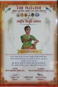 कोरबा। कला के संरक्षण एवं प्रचार प्रसार हेतु विगत दिनों आदि देव कला संस्थान जबलपुर द्वारा अखिल भारतीय राष्ट्रीय स्तर संगीत एवं नृत्य प्रतियोगिता रेवा महोत्सव का आयोजन किया गया था। जबलपुर के रॉयल सीनियर सेकेंडरी स्कूल संजीवनी नगर में आयोजित दो दिवसीय प्रतियोगिता में देश भर के अनेक हिस्सों से लगभग 5000 प्रतिभागियों ने हिस्सा लिया। यहां इशिता कश्यप की उपलब्धियो को देखते हुए विशेष प्रस्तुति के लिए आमंत्रित किया गया।