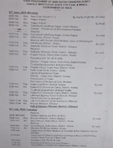 कोरबा। भारत सरकार के कोयला एवं खान राज्य मंत्री सतीश चंद्र दुबे आज कोरबा प्रवास पर आ रहे हैं। वे दोपहर साढ़े तीन बजे दीपका पहुंचेंगे। सर्वप्रथम श्री दुबे प्रगति हाउस दीपका में एक पेड़ मां के नाम कार्यक्रम के अंतर्गत पौधा रोपित करेंगे। स्थानीय स्तर पर आयोजित विभिन्न कार्यक्रमों में भाग लेकर वे शाम चार बजे दीपका में ही व्यू प्वाइंट का शिलान्यास करेंगे, जहां जिले को संबोधित करने के साथ स्थानीय कार्यकर्ताओं द्वारा उनका स्वागत-अभिनंदन किया जाएगा। इसके बाद शाम 5.20 बजे दीपका में ही केसीसी ठेकेदार कैम्प में शिरकत करेंगे और यहां के कार्यक्रमों में भाग लेने के पश्चात शाम 5.50 बजे दीपका से ही बिलासपुर के लिए रवाना हो जाएंगे।