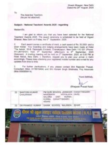 पीएम श्री स्कूल जवाहर नवोदय विद्यालय सलोरा जिला कोरबा के शिक्षक संतोष कुमार चौरसिया ने किया छत्तीसगढ़ को गौरवांवित