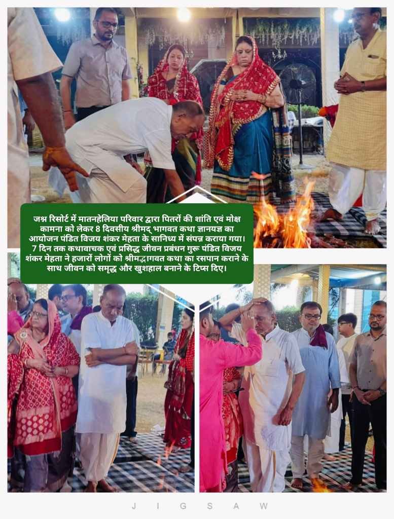 जश्न रिसोर्ट में मातनहेलिया परिवार द्वारा पितरों की शांति एवं मोक्ष कामना को लेकर 8 दिवसीय श्रीमद् भागवत कथा ज्ञानयज्ञ का आयोजन पंडित विजय शंकर मेहता के सानिध्य में संपन्न कराया गया। 7 दिन तक कथावाचक एवं प्रसिद्ध जीवन प्रबंधन गुरू पंडित विजय शंकर मेहता ने हजारों लोगों को श्रीमद्भागवत कथा का रसपान कराने के साथ जीवन को समृद्ध और खुशहाल बनाने के टिप्स दिए। श्री हनुमान चालीसा पर उपस्थित जनों को मन नियंत्रण के लिए ध्यान भी कराया और कहा कि प्रतिदिन भगवान की मूर्ति के समक्ष ध्यान करने से मन में शांति आती है और क्रोध पर नियंत्रण होने के साथ घर में सकारात्मक ऊर्जा का संचार होता है और घर की कलह मिट जाती है और नई पीढ़ी भी आबाद होती है।