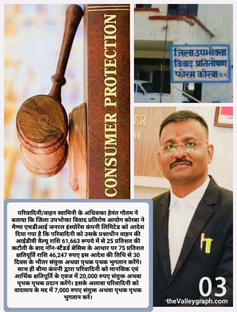जिला उपभोक्ता विवाद निवारण आयोग कोरबा (छत्तीसगढ़) की अध्यक्ष रंजना दत्ता एवं सदस्य जिला उपभोक्ता विवाद निवारण आयोग कोरबा पंकज कुमार देवड़ा की ओर से मैग्मा एच.डी.आई. जनरल इंश्योरेंस कंपनी लिमिटेड आदेश दिया गया है कि…,