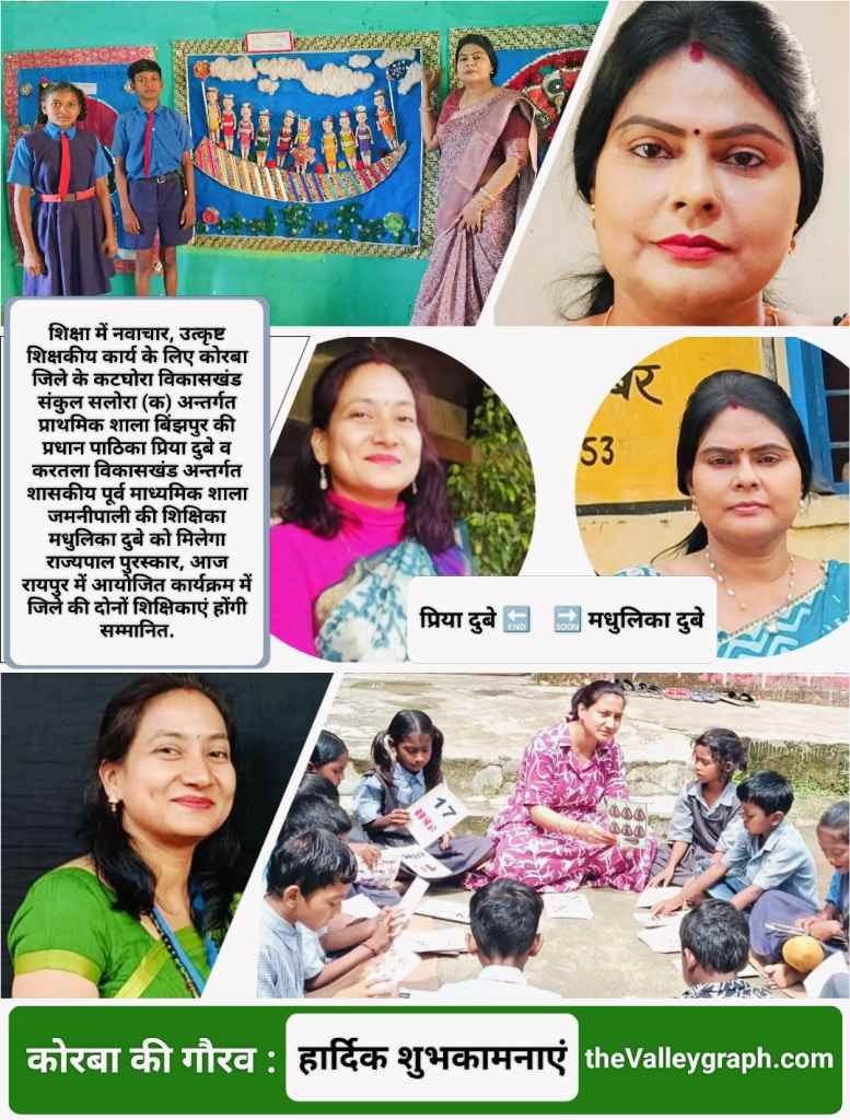विद्यार्थियों को उत्कृष्ट ढंग से शिक्षा प्रदान करने वाले राज्य भर के शिक्षकों को शिक्षक दिवस पर सम्मानित किया जाता है। विभिन्न जिलों के शिक्षकों का सम्मान के लिए चयन किया गया है। इस सूची में जिले के कटघोरा विकासखंड संकुल सलोरा (क) अन्तर्गत प्राथमिक शाला बिंझपुर की प्रधान पाठिका प्रिया दुबे व करतला विकासखंड अन्तर्गत शासकीय पूर्व माध्यमिक शाला जमनीपाली की शिक्षिका मधुलिका दुबे का नाम शामिल है। प्रिया दुबे बच्चों के संर्वागीण विकास के लिए निरंतर प्रयासरत हैं। समुदाय को जोड़कर शिक्षा के विकास में सकारात्मक परिवर्तन लाने का प्रयास अनुकरणीय है। दिव्यांग बच्चों के प्रमाण पत्र बनवाने से लेकर स्कूल के विकास में भी उनकी भागीदारी उत्कृष्ट रही है। शिक्षा कर्मी वर्ग 3 में सन् 2007 में उनकी नियुक्ति हुई थी। उनके उत्कृष्ट कार्यों को लेकर कई मंचों से उन्हें सम्मान मिल चुका है।