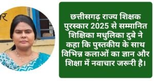 शिक्षिका मधुलिका दुबे बच्चों में नवाचार के माध्यम से पुस्तकीय ज्ञान के अलावा कला का भंडार भर रही हैं। शिक्षिका के साथ कवित्री की अनुठी प्रतिभा श्रीमती दुबे में है। बच्चों को विभिन्न नवाचार से वह शिक्षित कर रही हैं। ग्रामीण इलाकों के बच्चों को शहर के निजी स्कूलों की तरह की पढ़ाई के साथ उन्हें कला में निपुण बना रही है। इसे लेकर उन्हें कई सम्मान पहले भी मिल चुके हैं। आज राज्य स्तरीय मंच पर भी उनकी शिक्षा के क्षेत्र में दिए गए योगदान को सम्मान दिया जाएगा।