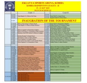 एकलव्य स्पोर्ट्स एरिना के भव्य कोर्ट में शुक्रवार को कोरबा बैडमिंटन लीग सीजन-2 का रोमांचक आगाज होगा। केबीएल 2 का चैम्पियनशिप जीतने इस बार पुष्पा से एकलव्य और द्रोणाचार्य क्लब की भिड़ंत देखने को मिलेगी। वुल्फ क्लब, बालको शटलर्स, न्यूक्लियस क्लब एनटीपीसी व टीम राजपूत भी मैदान में मुकाबले को तैयार है। टूर्नामेंट के मैच शुक्रवार को सुबह 9 बजे से शुरू होंगे।