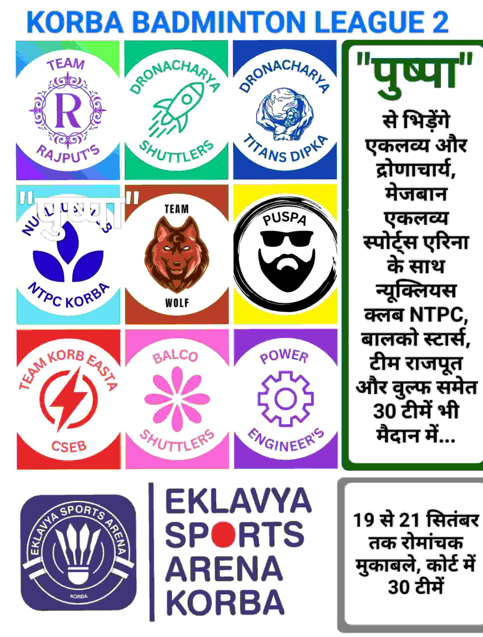 एकलव्य स्पोर्ट्स एरिना के भव्य कोर्ट में शुक्रवार को कोरबा बैडमिंटन लीग सीजन-2 का रोमांचक आगाज होगा। केबीएल 2 का चैम्पियनशिप जीतने इस बार पुष्पा से एकलव्य और द्रोणाचार्य क्लब की भिड़ंत देखने को मिलेगी। वुल्फ क्लब, बालको शटलर्स, न्यूक्लियस क्लब एनटीपीसी व टीम राजपूत भी मैदान में मुकाबले को तैयार है। टूर्नामेंट के मैच शुक्रवार को सुबह 9 बजे से शुरू होंगे।