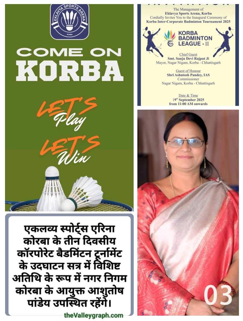 एकलव्य स्पोर्ट्स एरिना में आयोजित कोरबा बैडमिंटन लीग का शुभारंभ आज सुबह 11 बजे कोरबा की प्रथम महिला एवं महापौर श्रीमती संजू देवी राजपूत करेंगी। इस अवसर पर निगमायुक्त आशुतोष पांडेय विशिष्ट अतिथि के रूप में मौजूद रहेंगे।