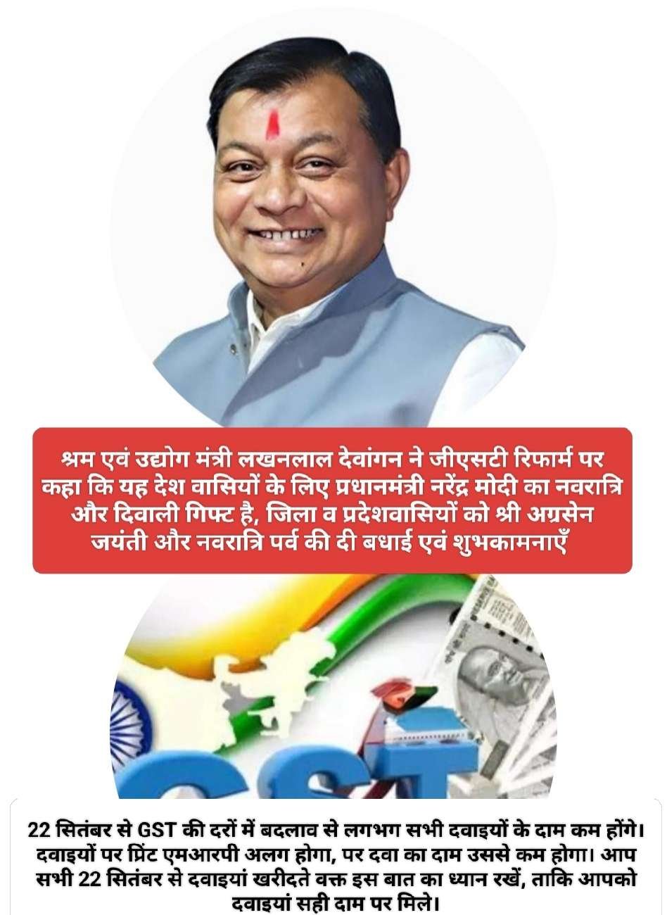 उद्योग मंत्री श्री लखन लाल देवांगन ने कहा कि जीएसटी रिफार्म देश वासियों को प्रधानमंत्री नरेंद्र मोदी का नवरात्रि और दिवाली गिफ्ट है, जिलेवासियों को श्री अग्रसेन जयंती और नवरात्रि पर्व की दी बधाई एवं शुभकामनाएँ