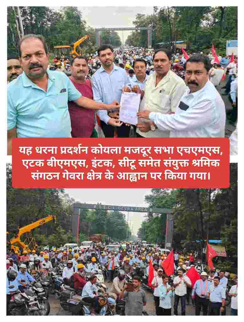 कोरबा। बुधवार को गेवरा क्षेत्र के गेवरा परियोजना के मेन गेट श्रमिक चौक में विशाल गेट मीटिंग एवं धरना प्रदर्शन किया गया। यह गेट मीटिंग एवं धरना प्रदर्शन 22 /09/25 को हुई माननीकरण समिति की बैठक स्थगित होने के विरोध में संयुक्त श्रमिक संगठन गेवरा क्षेत्र जिसमें कोयला मजदूर सभा एचएमएस, एटक बीएमएस, इंटक, सीटू संगठन शामिल रहे।