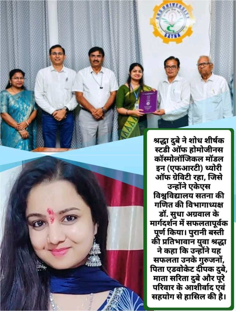 कोरबा। ऊर्जानगरी कोरबा की मेधावी शोधार्थी श्रद्धा दुबे ने अपनी शैक्षणिक प्रतिभा का परिचय देते हुए गणित विषय में पीएचडी की उपाधि प्राप्त की है। उनका शोध शीर्षक स्टडी ऑफ होमोजीनस कॉस्मोलॉजिकल मॉडल इन (एफआरटी) थ्योरी ऑफ ग्रेविटी रहा, जिसे उन्होंने एकेएस विश्वविद्यालय सतना की गणित की विभागाध्यक्ष डॉ. सुधा अग्रवाल के मार्गदर्शन में सफलतापूर्वक पूर्ण किया। पुरानी बस्ती की प्रतिभावान युवा श्रद्धा ने कहा कि उन्होंने यह सफलता उनके गुरुजनों, पिता एडवोकेट दीपक दुबे, माता सरिता दुबे और पूरे परिवार के आशीर्वाद एवं सहयोग से हासिल की है। इस सफलता पर विश्वविद्यालय के चांसलर अनंत कुमार सोनी, वाइस चांसलर आरएस त्रिपाठी, सीओई डॉ. शेखर मिश्रा, बेसिक साइंस डीन डॉ. शैलेंद्र यादव ने हर्ष व्यक्त करते हुए उज्जवल भविष्य की कामना की है।