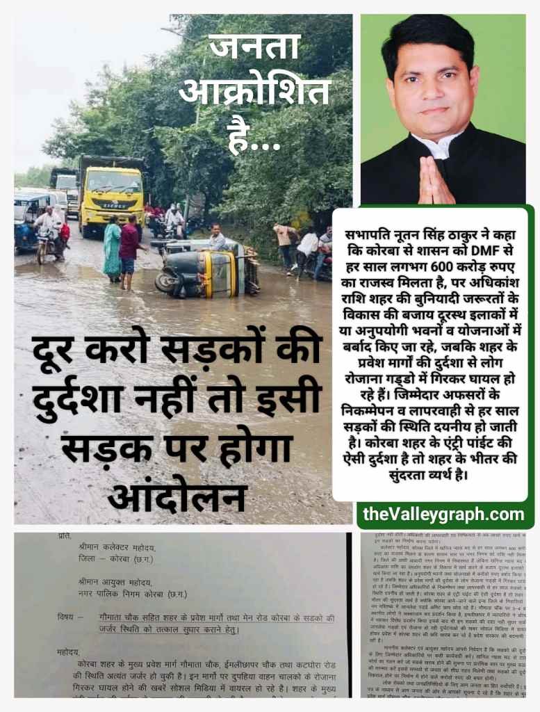नगर पालिक निगम कोरबा के सभापति नूतनसिंह ठाकुर ने कहा है कि शहर के मुख्य प्रवेश मार्गों की दुर्दशा एवं गड्ढों में गिरकर लोगों के घायल होने की घटनाओं को आंख मूंदकर नहीं देख सकते हैं। कोरबा कलेक्टर एवं एक सप्ताह के भीतर इन प्रवेश मार्गों में स्थित जानलेवा गड्ढों की मरम्मत एवं नवनिर्माण के लिए उपाय करने का निवेदन किया। अन्यथा सड़कों की दुर्दशा पर आक्रोशित आम जनता के साथ मिलकर आंदोलन किया जाएगा।