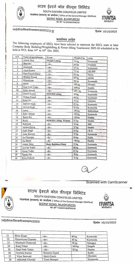 कोरबा। साउथ ईस्टर्न कोल फील्ड्स लिमिटेड (एसइसीएल) के 38 कर्मचारी इंटर कंपनी बॉडी बिल्डिंग-वेटलिफ्टिंग और पावर लिफ्टिंग टूर्नामेंट 2025-26 में एसईसीएल का प्रतिनिधित्व करने चुने गए हैं। इनमें कुसमुंडा, कोरबा एवं गेवरा क्षेत्र से भी 20 कर्मी शामिल हैं। चयनित कर्मचारियों को संबंधित क्षेत्र के महाप्रबंधक एवं विभागाध्यक्षों को स्पर्धा के लिए मुक्त करने निर्देशित किया गया है।