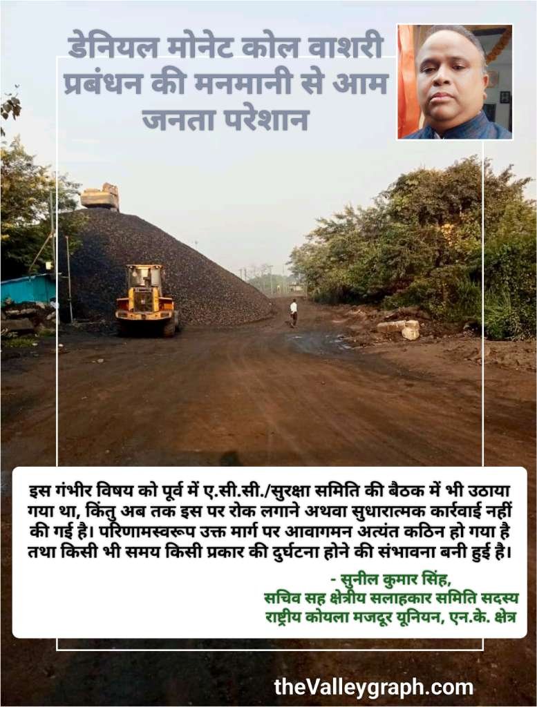 डेनियल मोनेट कोल वाशरी द्वारा पब्लिक रोड पर कोयला स्टॉक कर लोडिंग कार्य किए जाने की शिकायत करते हुए एनके क्षेत्र डकरा सीसीएल के महाप्रबंधक को पत्र लिखा गया है। सुनील कुमार सिंह, सचिव सह क्षेत्रीय सलाहकार समिति सदस्य, राष्ट्रीय कोयला मजदूर यूनियन, एन.के. क्षेत्र द्वारा लिखे गए पत्र में तत्काल जांच कर आवश्यक कार्रवाई सुनिश्चित करने की मांग की गई है, ताकि सार्वजनिक मार्ग पर सुरक्षित एवं निर्बाध आवागमन बहाल हो सके।