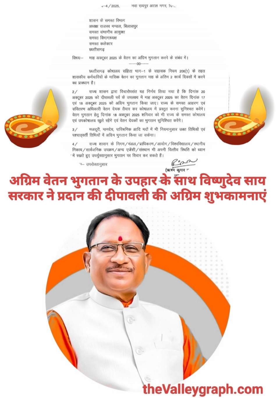 शासकीय कर्मचारियों के लिए अच्छी खबर है। दीपावाली के त्यौहार को देखते हुए मुख्यमंत्री विष्णुदेव साय की सरकार ने कर्मियों के अक्टूबर माह के वेतन का अग्रिम भुगतान करने का निर्णय लिया है। इस सम्बन्ध में वित्त विभाग के उप सचिव ऋषभ कुमार पाराशर ने आदेश जारी कर दिए हैं। इसमें 17 एवं 18 अक्टूबर तक, दो दिन के भीतर वेतन जारी करने कहा गया है।