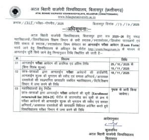 बिलासपुर/कोरबा। अटल बिहारी वाजपेयी विश्वविद्यालय, बिलासपुर द्वारा “राष्ट्रीय शिक्षा नीति 2020” के अंतर्गत आयोजित की जाने वाली सत्र 2025-26 हेतु समस्त शासकीय एवं अशासकीय महाविद्यालयों एवं विश्वविद्यालय शिक्षण विभाग में नामांकित स्नातक (बीए, बीएससी, बीएससी होम साइंस, बीसीए, बीकॉम, बीबीए) पाठ्यक्रमों का नियमित / स्वाध्यायी/एटीकेटी प्रथम/तृतीय सेमेस्टर परीक्षा का आनलाईन परीक्षा आवेदन पत्र (एग्जाम फॉर्म) विश्वविद्यालय के अधिकृत वेब पोर्टल https://exam.bucgexam.in के माध्यम से भरे जाने हेतु निम्नानुसार तिथि निर्धारित की गई है…