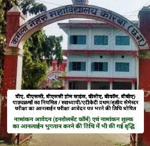 कमला नेहरू महाविद्यालय कोरबा के प्राचार्य डॉ प्रशांत बोपापुरकर ने कहा कि अटल बिहारी वाजपेयी विश्वविद्यालय, बिलासपुर से जारी दिशा निर्देशों से विद्यार्थियों को अवगत कराया जा रहा है। उन्होंने विद्यार्थियों को निर्धारित समय के भीतर अनिवार्य प्रक्रिया पूर्ण करने कहा है। परीक्षा आवेदन भरने संबंधी किसी भी प्रकार की जानकारी के लिए छात्र छात्राओं को महाविद्यालय के हेल्प डेस्क से संपर्क करने कहा गया है।
