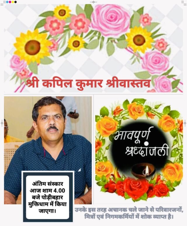 कोरबा। नगर पालिक निगम कोरबा में अपर डिवीजन क्लर्क के पद पर कार्यरत श्री कपिल कुमार श्रीवास्तव (54 वर्ष) बुधवार-गुरुवार की मध्यरात्रि आकस्मिक निधन हो गया। एमआईजी – 1/64, महाराणा प्रताप नगर, कोरबा स्थित निवास पर अचानक तबियत बिगड़ने पर उन्हें अस्पताल में भर्ती कराया गया था। देर रात्रि 1.30 बजे उन्होंने अंतिम सांसें ली। वे कमला नेहरू महाविद्यालय कोरबा में वरिष्ठ लिपिक श्री अमृत श्रीवास्तव के छोटे भाई व प्रतीक श्रीवास्तव और लक्ष्य श्रीवास्तव के पिता हैं। वे अपने पीछे पत्नी-सुपुत्रों समेत भरा पूरा परिवार शोकाकुल छोड़ गए। अंतिम संस्कार आज शाम 04.00 बजे पोड़ीबहार मुक्तिधाम में किया जाएगा। इस खबर से निगमकर्मियों में शोक की लहर है। नगर निगम के साथी कर्मचारियों एवं महाविद्यालय परिवार ने शोक व्यक्त करते हुए ईश्वर से उनके परिवार को यह असीम दुःख सहने की शक्ति देने प्रार्थना की है।