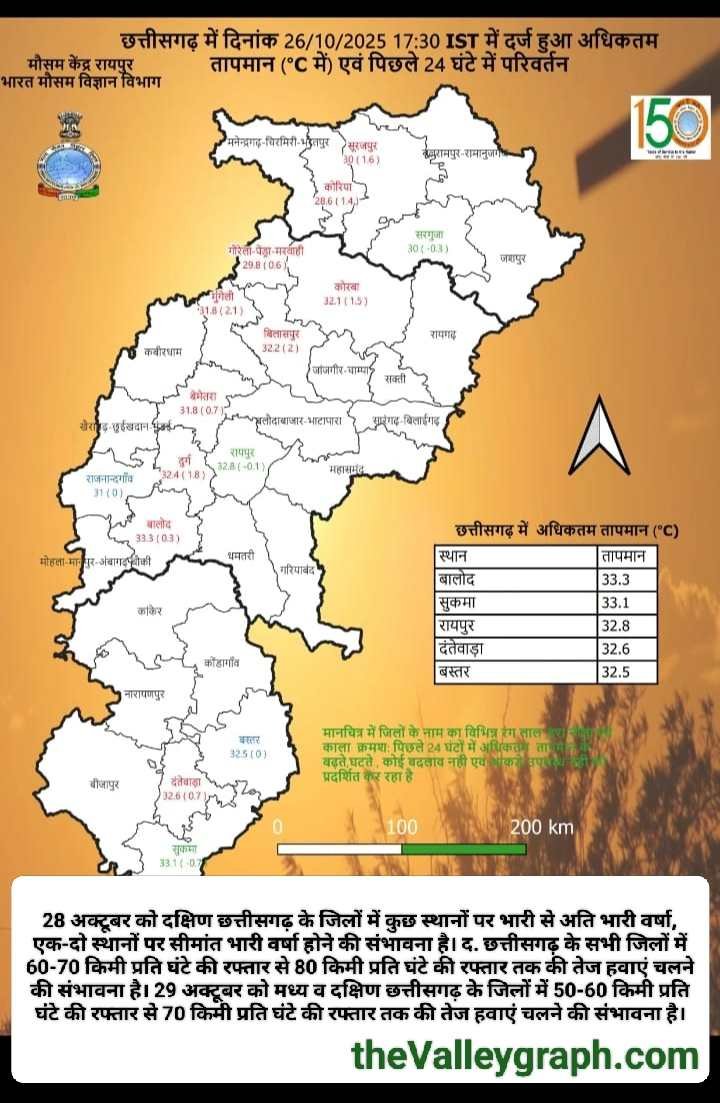 रविवार को जारी किए गए 28 अक्टूबर के लिए पूर्वानुमान पर गौर करें तो दक्षिण छत्तीसगढ़ के विभिन्न जिलों में कुछ स्थानों पर भारी से अति भारी वर्षा और एक-दो स्थानों पर सीमांत भारी वर्षा होने की संभावना है।