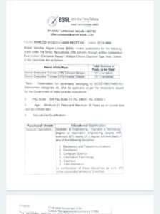 भारत संचार निगम लिमिटेड (BSNL) में लिखित प्रतियोगी परीक्षा (कंप्यूटर आधारित बहुविकल्पीय वस्तुनिष्ठ प्रकार परीक्षा) के माध्यम से सीधी भर्ती (DR) की जाएगी। इस स्कीम के अंतर्गत कुल 120 पदों के लिए आवेदन आमंत्रित किए गए हैं।