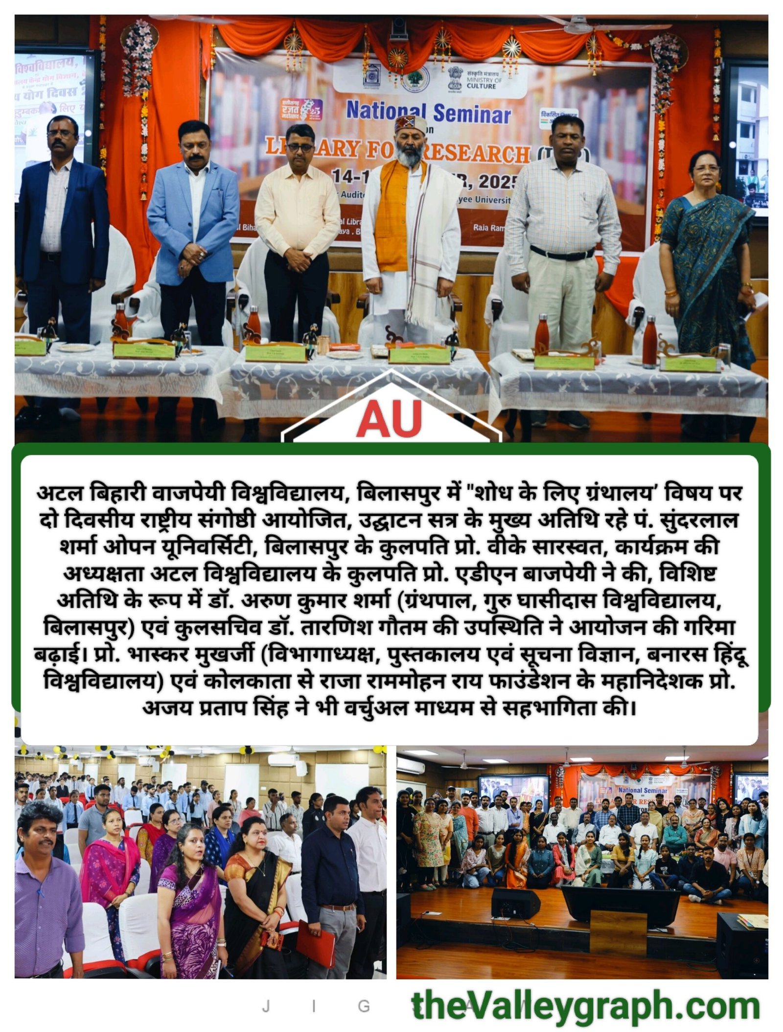 अटल बिहारी वाजपेयी विश्वविद्यालय, बिलासपुर में माधवराव सप्रे सेंट्रल लाइब्रेरी के तत्वावधान में 14–15 अक्टूबर 2025 को दो दिवसीय राष्ट्रीय संगोष्ठी का सफल आयोजन किया गया। संगोष्ठी का मुख्य विषय था ‘शोध के लिए ग्रंथालय’ (Library for Research), जिसने शोध कार्यों में ग्रंथालयों की भूमिका और उपयोगिता को केंद्र में रखा।