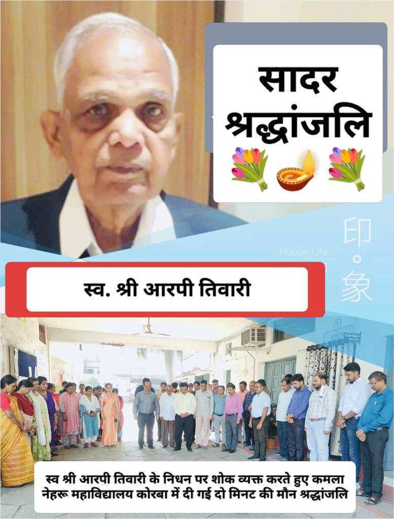 नगर पालिक निगम कोरबा के पूर्व उपायुक्त स्व. श्री आरपी तिवारी के निधन पर शोक व्यक्त करते हुए मंगलवार की दोपहर कमला नेहरु महाविद्यालय कोरबा में शोक सभा रखी गई थी। प्राचार्य डाॅ प्रशांत बोपापुरकर समेत सहायक प्राध्यापकों, कर्मचारियों एवं छात्र-छात्राओं ने दो मिनट की मौन श्रद्धांजलि अर्पित करते हुए ईश्वर से दिवंगत आत्मा की शांति की प्रार्थना की गई।