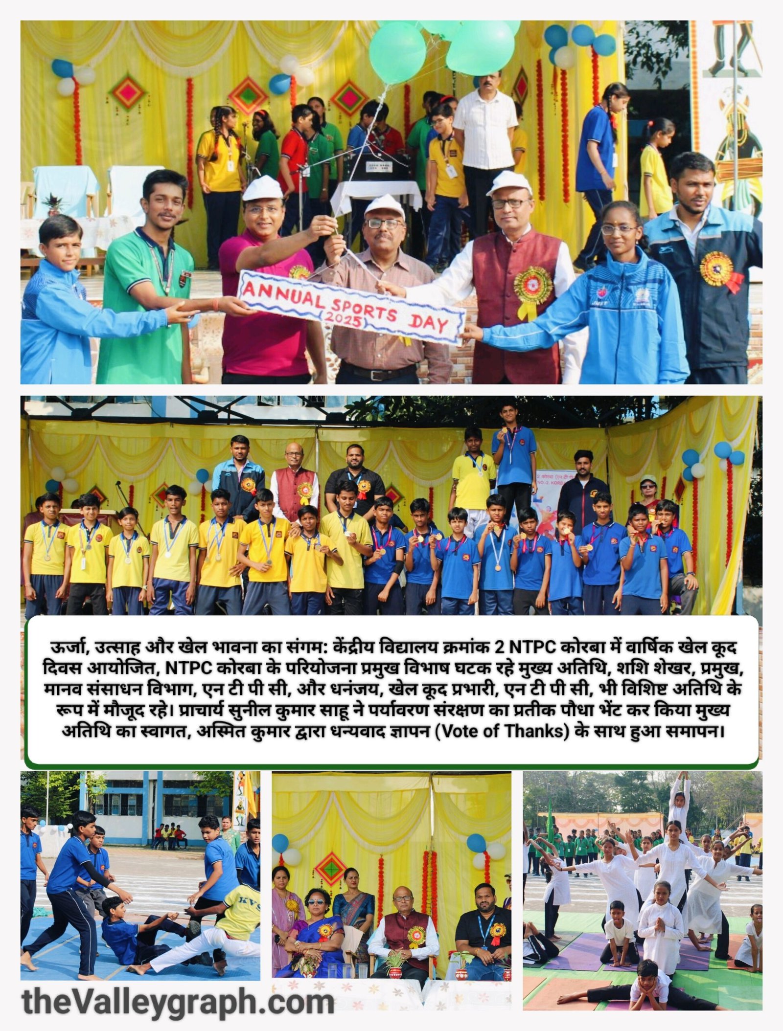 ऊर्जा, उत्साह और खेल भावना का संगम: केंद्रीय विद्यालय क्रमांक 2 NTPC कोरबा में वार्षिक खेल कूद दिवस आयोजित, NTPC कोरबा के परियोजना प्रमुख विभाष घटक रहे मुख्य अतिथि।