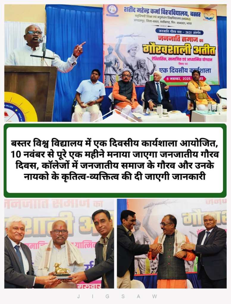 बस्तर विश्व विद्यालय में एक दिवसीय कार्यशाला आयोजित, 10 नवंबर से पूरे एक महीने मनाया जाएगा जनजातीय गौरव दिवस, कॉलेजों में जनजातीय समाज के गौरव और उनके नायको के कृतित्व-व्यक्तित्व की दी जाएगी जानकारी