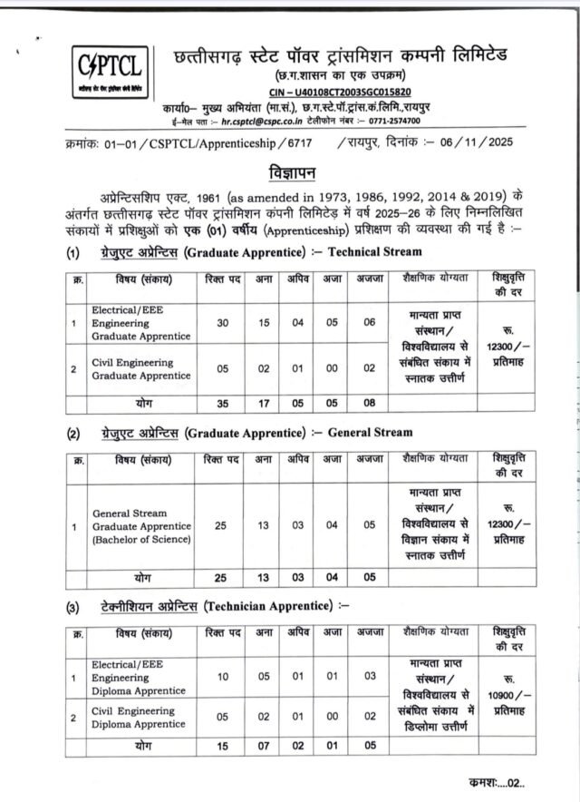 छत्तीसगढ़ स्टेट पावर ट्रांसमिशन कंपनी लिमिटेड (CSPTCL) ने अधिनियम 1961 के अंतर्गत Graduate, Diploma और General Stream Apprentices के लिए प्रशिक्षण (Apprenticeship) हेतु अधिसूचना जारी की है। चयन 2025-26 सत्र के लिए किया जाएगा। आवेदन करने की अंतिम तिथि 05 दिसंबर 2025 है। कुल 75 पदों पर ऑनलाइन आवेदन भरने के लिए अधिकृत वेबसाइट www.cspc.co.in पर लॉगिन किया जा सकता है।