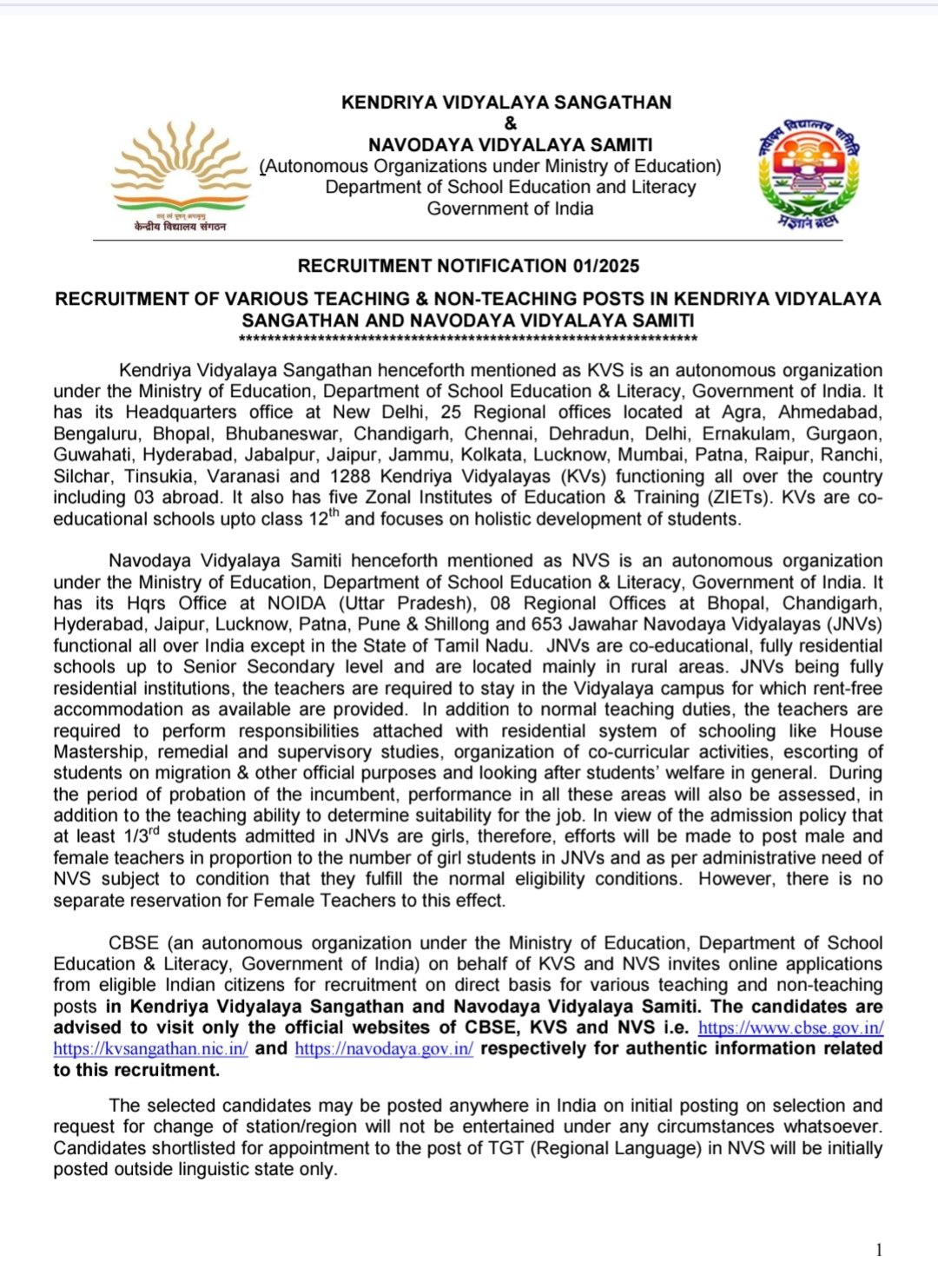 सीबीएसई (शिक्षा मंत्रालय, स्कूल शिक्षा एवं साक्षरता विभाग, भारत सरकार के अधीन एक स्वायत्त संगठन), केवीएस और एनवीएस की ओर से, केंद्रीय विद्यालय संगठन और नवोदय विद्यालय समिति में विभिन्न शिक्षण और गैर-शिक्षण पदों पर सीधी भर्ती हेतु पात्र भारतीय नागरिकों से ऑनलाइन आवेदन आमंत्रित करता है। उम्मीदवारों को सलाह दी जाती है कि वे इस भर्ती से संबंधित प्रामाणिक जानकारी के लिए केवल सीबीएसई, केवीएस और एनवीएस की आधिकारिक वेबसाइटें, क्रमशः https://www.cbse.gov.in/https://kvsangathan.nic.in/ और https://navodaya gov.in/ देखें।