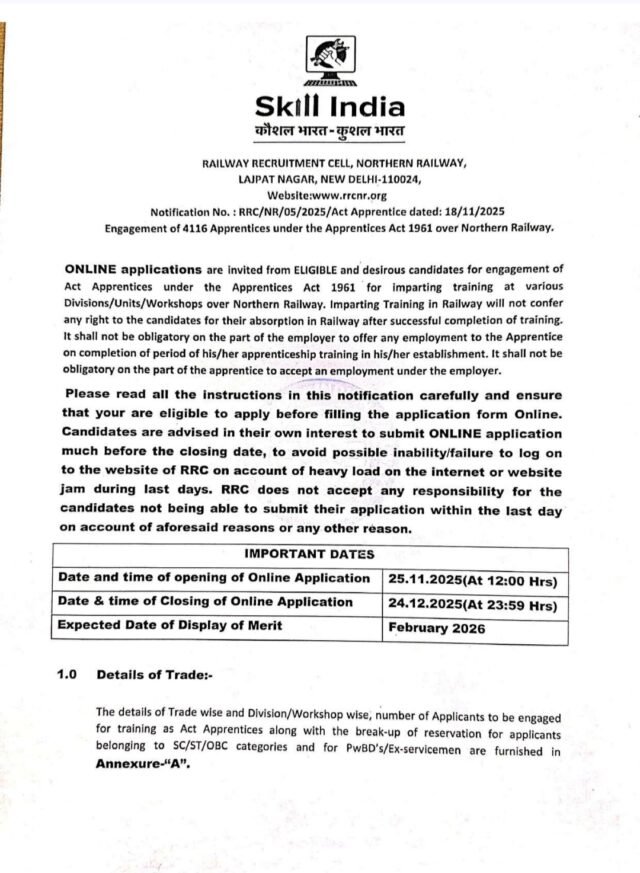 कौशल भारत – कुशल भारत (रेलवे भर्ती प्रकोष्ठ, उत्तर रेलवे, लाजपत नगर, नई दिल्ली-110024) के तहत उत्तर रेलवे ने अप्रेंटिस के विभिन्न पदों पर भर्ती का विस्तृत नोटिफिकेशन जारी किया है। इस प्रक्रिया के अंतर्गत उत्तर रेलवे में अप्रेंटिस के कुल 4116 पदों पर भर्ती की जाएगी। भर्ती के लिए 10वीं पास आईटीआई अभ्यर्थी आवेदन फॉर्म भर सकते हैं। इनमें महिला एवं पुरुष अभ्यर्थियों को ऑनलाइन मोड में आवेदन फॉर्म भरना होगा। उत्तर रेलवे भर्ती के लिए आवेदन 25 नवंबर से लेकर 24 दिसंबर 2025 तक भरे जाएंगे।