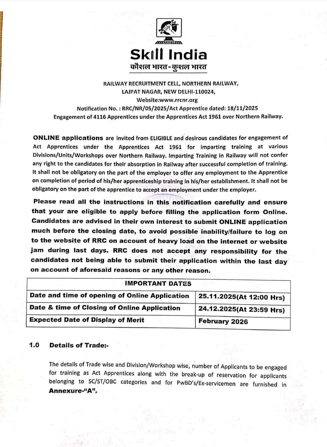 उत्तर रेलवे के विभिन्न मंडलों/इकाइयों/कार्यशालाओं में प्रशिक्षण प्रदान करने हेतु प्रशिक्षु अधिनियम 1961 के अंतर्गत एक्ट अप्रेंटिस की नियुक्ति हेतु पात्र एवं इच्छुक अभ्यर्थियों से ऑनलाइन आवेदन आमंत्रित किए जाते हैं। रेलवे में प्रशिक्षण प्रदान करने से अभ्यर्थियों को प्रशिक्षण सफलतापूर्वक पूरा करने के बाद रेलवे में आमेलन का कोई अधिकार नहीं मिलेगा। नियोक्ता के लिए यह अनिवार्य नहीं होगा कि वह अपने प्रतिष्ठान में प्रशिक्षुता प्रशिक्षण की अवधि पूरी करने पर प्रशिक्षु को कोई रोजगार प्रदान करे। प्रशिक्षु के लिए नियोक्ता के अधीन रोजगार स्वीकार करना अनिवार्य नहीं होगा।