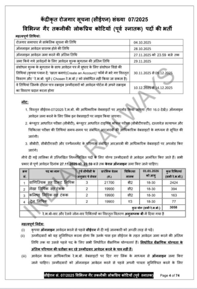 रेलवे भर्ती बोर्ड द्वारा एनटीपीसी 12th लेवल के कुल 3058 पदों पर भर्ती की जाएगी रेलवे एनटीपीसी 12th लेवल भर्ती के लिए ऑनलाइन आवेदन 28 अक्टूबर से लेकर 27 नवंबर 2025 तक भरे जाएंगे जबकि ऑनलाइन आवेदन शुल्क जमा करने की अंतिम तिथि 29 नवंबर 2025 तक रखी गई है रेलवे एनटीपीसी 12th लेवल आवेदन फार्म में संशोधन का अवसर 30 नवंबर से लेकर 9 दिसंबर 2025 तक दिया गया है।