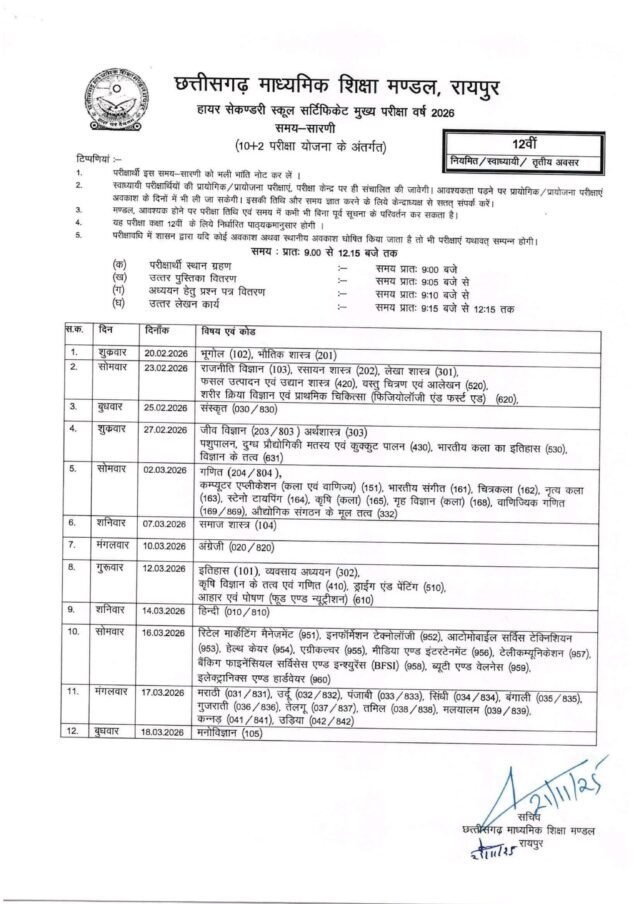 रायपुर। छत्तीसगढ़ माध्यमिक शिक्षा मंडल ने नया साल लगने से पहले ही 10वीं और 12वीं बोर्ड परीक्षा का समय सारणी जारी कर दिया है। कक्षा 12वीं की परीक्षा 20 फरवरी से और 10वीं की परीक्षा 21 फरवरी से शुरू होगी।