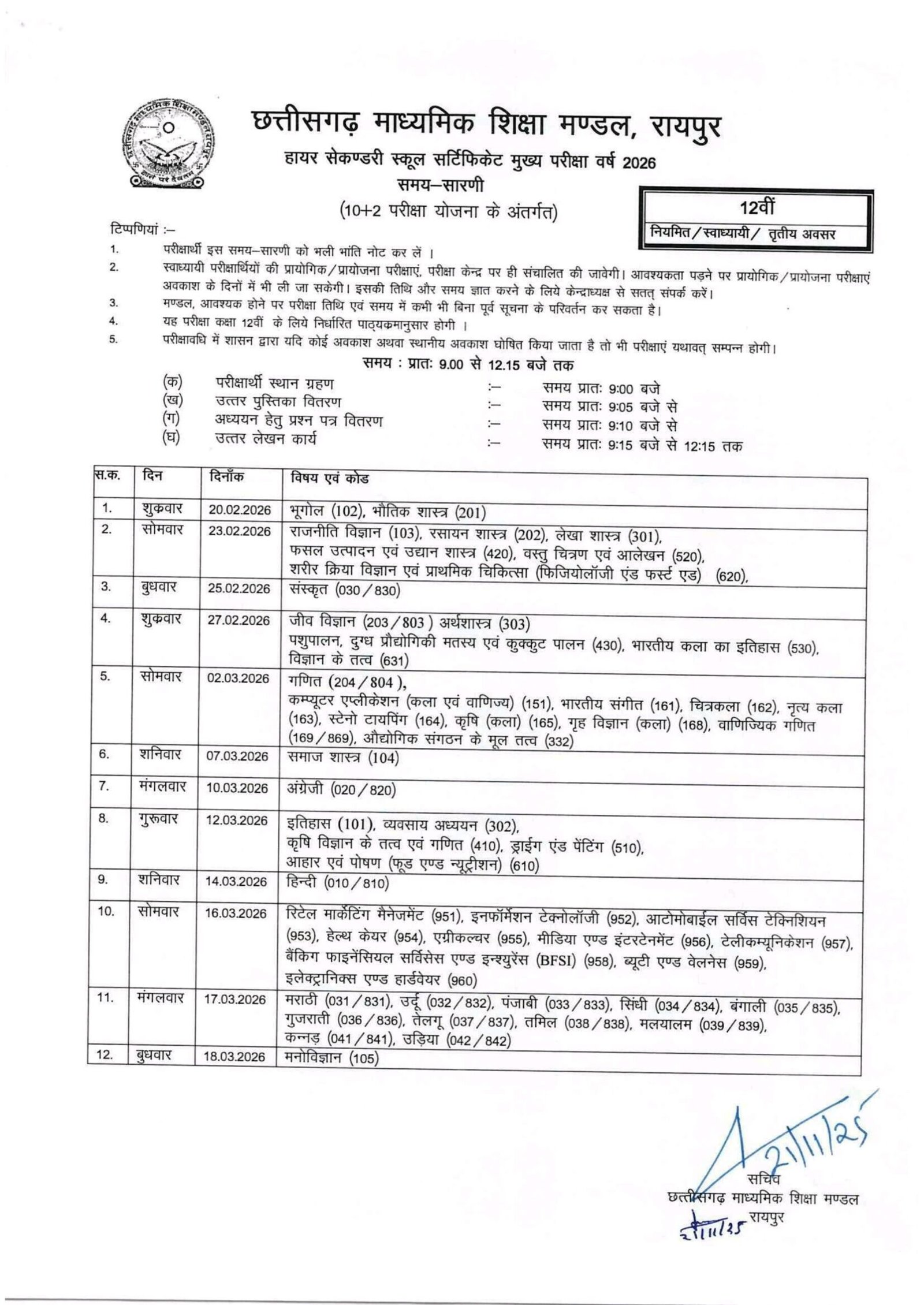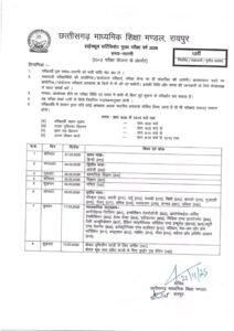 छत्तीसगढ़ माध्यमिक शिक्षा मंडल के सचिव पुष्पा साहू ने 10वीं और 12वीं बोर्ड की मुख्य परीक्षा के लिए टाइम टेबल जारी किया। उन्होंने बताया कि 12वीं बोर्ड की परीक्षा 20 फरवरी से शुरू होकर 18 मार्च को खत्म होगी। दूसरी ओर 10वीं की बोर्ड परीक्षा 21 फरवरी से शुरू होकर 13 मार्च को खत्म होगी। दोनों बोर्ड कक्षाओं में होली के दिन की परीक्षा नहीं होगी। परीक्षा में लगभग प्रदेशभर से लगभग 6 लाख विद्यार्थी में शामिल होंगे।