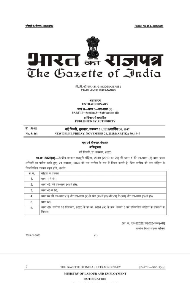 भारत सरकार ने शुक्रवार को देश के श्रम क्षेत्र में ऐतिहासिक बदलाव करते हुए 29 पुराने श्रम कानूनों को खत्म कर चार नए लेबर कोड तुरंत प्रभाव से लागू कर दिए हैं. ये चार कोड हैं कोड ऑन वेजेज 2019 (Code on Wages, 2019), इंडस्ट्रियल रिलेशन कोड 2020 (Industrial Relations Code, 2020), सोशल सिक्योरिटी कोड 2020 (Code on Social Security, 2020) और ऑक्यूपेशनल सेफ्टी हेल्थ एंड वर्किंग कंडीशंस कोड 2020 (Occupational Safety, Health and Working Conditions Code, 2020). श्रम मंत्री मनसुख मंडाविया ने प्रेस कॉन्फ्रेंस में बताया कि इन चारों कोड को नोटिफाई कर दिया गया है और अब ये देश का कानून हैं।