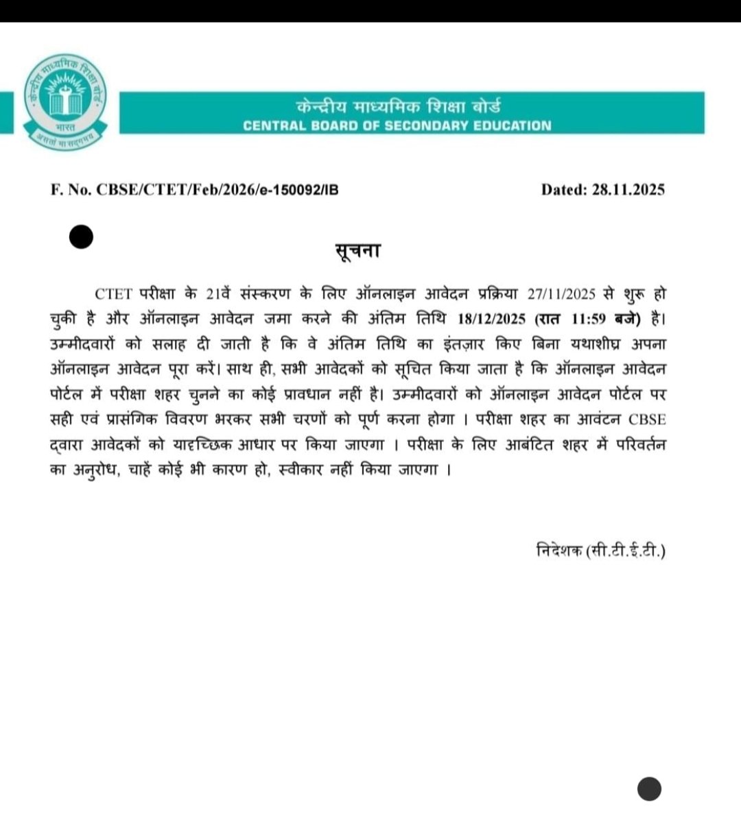CTET परीक्षा के 21वें संस्करण के लिए ऑनलाइन आवेदन प्रक्रिया 27/11/2025 से शुरू हो चुकी है और ऑनलाइन आवेदन जमा करने की अंतिम तिथि 18/12/2025 (रात 11:59 बजे) है। उम्मीदवारों को सलाह दी जाती है कि वे अंतिम तिथि का इंतज़ार किए बिना यथाशीघ्र अपना ऑनलाइन आवेदन पूरा करें। साथ ही, सभी आवेदकों को सूचित किया जाता है कि ऑनलाइन आवेदन पोर्टल में परीक्षा शहर चुनने का कोई प्रावधान नहीं है। उम्मीदवारों को ऑनलाइन आवेदन पोर्टल पर सही एवं प्रासंगिक विवरण भरकर सभी चरणों को पूर्ण करना होगा। परीक्षा शहर का आवंटन सीबीएसई द्वारा आवेदकों को यादृच्छिक आधार पर किया जाएगा। परीक्षा के लिए आबंटित शहर में परिवर्तन का अनुरोध, चाहे कोई भी कारण हो, स्वीकार नहीं किया जाएगा।