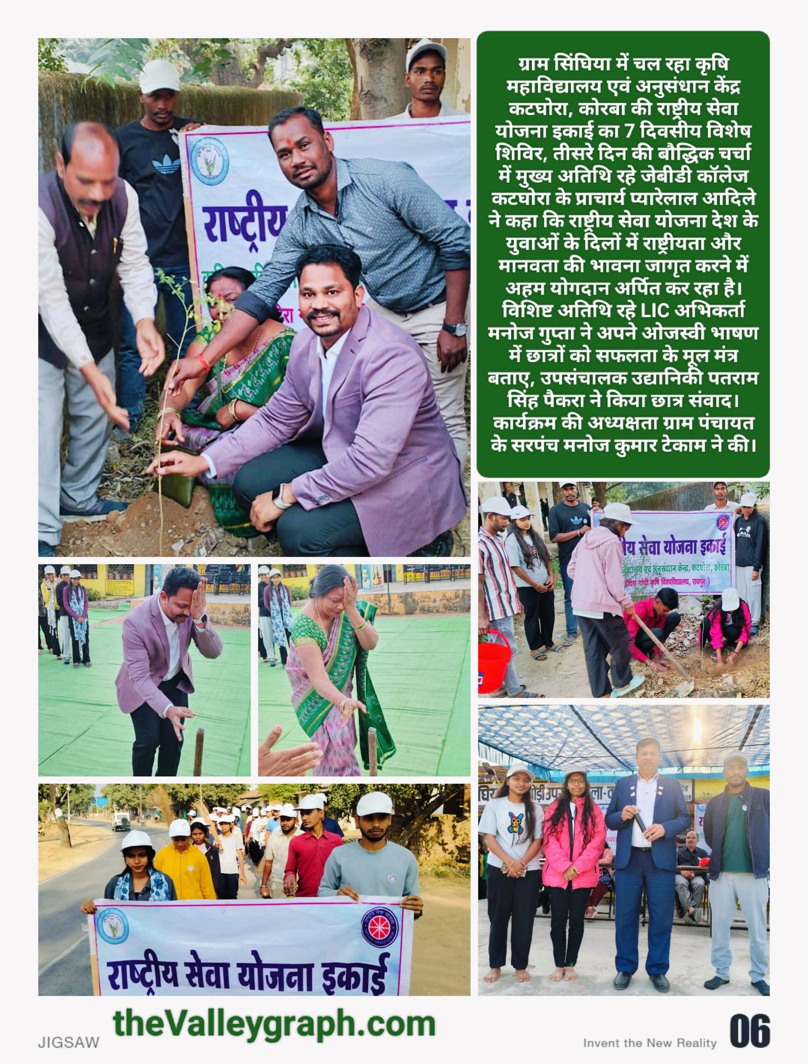कोरबा/कटघोरा। कृषि महाविद्यालय एवं अनुसंधान केंद्र कटघोरा कोरबा में संचालित राष्ट्रीय सेवा योजना इकाई के द्वारा सात दिवसीय विशेष शिविर का आयोजन ग्राम सिंधिया के सजेस स्कूल में 1 दिसंबर से किया जा रहा है। यह शिविर आगामी 7 दिसंबर तक चलेगा। इसमें विद्यार्थियों के द्वारा प्रातः दैनिक कार्य उपरांत 8:00 बजे से 11:00 बजे तक परियोजना कार्य करते हुए ग्राम रैली निकाल कर ग्राम पंचायत तथा शमशान का सफाई अभियान चलाया गया। मध्य बस्ती स्थित चौराहा में ग्राम वासियों को पानी व्यर्थ बहने से रोकने हेतु जागरूक किया गया। उनकी जानकारी को समझते हुए ग्रामीणों ने भी माना कि भविष्य में पानी व्यर्थ नहीं पाएंगे। तत्पश्चात दोपहर में तीसरे दिन की बौद्धिक चर्चा में मुख्य अतिथि रहे जेबीडी महाविद्यालय कटघोरा के प्राचार्य प्यारेलाल आदिले ने कहा कि राष्ट्रीय सेवा योजना देश के युवाओं के दिलों में राष्ट्रीयता और मानवता की भावना जागृत करने में अहम योगदान अर्पित कर रहा है।राष्ट्रीय सेवा योजना ने स्वामी विवेकानंद को आदर्श पुरुष के रूप में स्वीकार किया। छात्र-छात्राओं का मार्गदर्शन करते हुए उन्होंने अपने सार्थक और सारगर्भित चर्चा की, जिससे स्वयंसेवकों में देश की रक्षा और सामाजिक सौहार्द्र बनाने की प्रेरणा जागृत हो। इस अवसर पर विशिष्ट अतिथि रहे भारतीय जीवन बीमा निगम के वरिष्ठ अभिकर्ता मनोज कुमार गुप्ता ने अपने ओजस्वी भाषण में छात्रों को सफलता के मूल मंत्र बताए। उन्होंने कठिन परिश्रम, लक्ष्य निर्धारण और समाज का हित गुण को शामिल कर लक्ष्य की प्राप्ति के मार्ग बताए। जिला मुख्यालय से आए उपसंचालक उद्यानिकी पतराम सिंह पैकरा ने छात्र संवाद करते हुए बताया कि उद्यानिकी में किस तरीके से रोजगार के अवसर बढ़ रहे हैं। साथ ही साथ उद्यानिकी फसलों से कैसे लाभ कमाया जा सकता है और भविष्य को सुदृढ़ किया जा सकता है, इस विषय में उनके द्वारा सारगर्भित जानकारी प्रदान की गई । कृषि महाविद्यालय के सहायक प्राध्यापक डॉ प्रीयल पांडेय के द्वारा मृदा उर्वरता एवं मिट्टी नमूना एकत्रीकरण की विधि बताते हुए उसके लाभ समझाए। डॉ योगिता कश्यप सहायक प्राध्यापक कृषि महाविद्यालय ने शिक्षा के साथ पोषण कैसे किया जा सकता है, इस पर विषय में विस्तृत जानकारी दी गई। कार्यक्रम की अध्यक्षता ग्राम पंचायत के सरपंच मनोज कुमार टेकाम एवं उपाध्यक्षता देवनारायण डिक्सेना उप सरपंच ग्राम सिंधिया ने की। कार्यक्रम समाप्ति के पूर्व प्राचार्य प्यारेलाल आदिले द्वारा छात्र-छात्राओं के लिए मनोरंजक आयोजित किए। जिसमें मुख्य रूप से स्टोन और स्टिक का गेम काफी रोमांचकारी और मजेदार रहा। अंत में उद्यानिकी विभाग के द्वारा प्रदत 50 पौधों में से कुछ पौधों का रोपण स