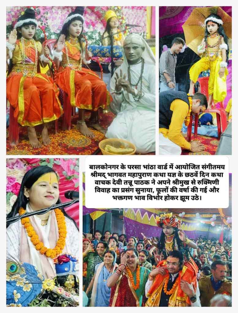 कोरबा/बालकोनगर। परसा भांठा वार्ड में आयोजित संगीतमय श्रीमद् भागवत महापुराण कथा यज्ञ के छठवें दिन कथा वाचक देवी तन्नू पाठक ने अपने श्रीमुख से रुक्मिणी विवाह का प्रसंग सुनाया, फूलों की वर्षा की गई और भक्तगण भाव विभोर होकर झूम उठे।