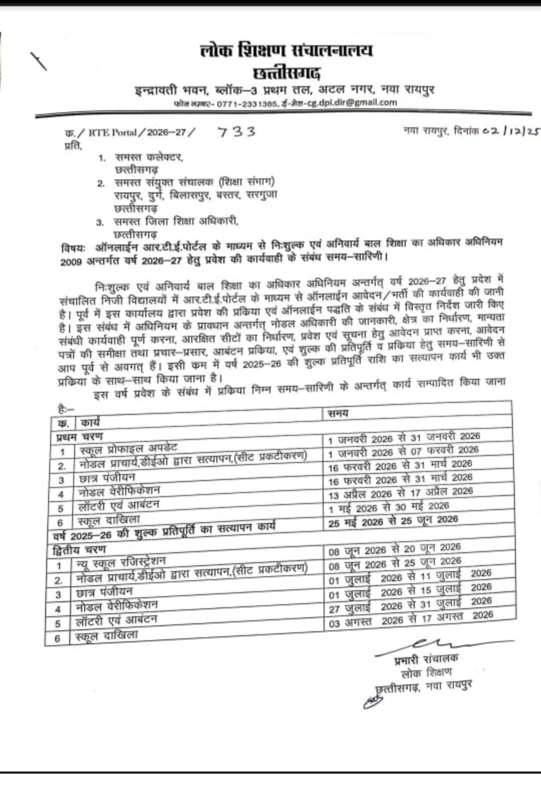 रायपुर/कोरबा। लोक शिक्षा निदेशालय छत्तीसगढ़ द्वारा ऑनलाईन आर.टी.ई. पोर्टल के माध्यम से निःशुल्क एवं अनिवार्य बाल शिक्षा का अधिकार अधिनियम 2009 अन्तर्गत वर्ष 2026-27 के प्रवेश की कार्यवाही की समय सारिणी जारी कर दी गई है। इसमें बताया गया है कि नए साल की पहली तारीख यानी एक जनवरी को स्कूल प्रोफाइल अपडेट प्रारंभ होने के साथ ही RTE से निःशुल्क प्रवेश की प्रारंभिक प्रक्रिया शुरू हो जाएगी। इस संबंध में सभी कलेक्टर एवं जिला शिक्षा अधिकारियों को दिशा निर्देश जारी कर दिए गए हैं।
