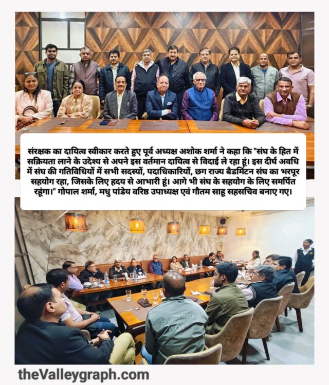 बुधवार 10 दिसम्बर को शाम 7.30 बजे टीपी नगर स्थित होटल औरा गोल्ड में हुई इस बैठक दो प्रमुख विषयों पर चर्चा की गई। इनमें फरवरी 2026 की छत्तीसगढ़ राज्य मास्टर्स बैडमिंटन स्पर्धा की रूप रेखा एवं कोरबा जिला बैडमिंटन संघ कार्यकारिणी पुनर्गठन पर विचार के बाद नए निर्णय लिए गए। गोपाल शर्मा एवं श्रीमती मधु पांडेय वरिष्ठ उपाध्यक्ष एवं गौतम साहू सहसचिव के पद पर नियुक्त किए गए हैं। संघ में विस्तार करते हुए नए सदस्य भी शामिल किए गए हैं। इनमें तापस खस्तगीर, दीपक सोनी, सूर्यकांत ठाकुर, संजय शाह एवं गौतम साहू शामिल हैं।