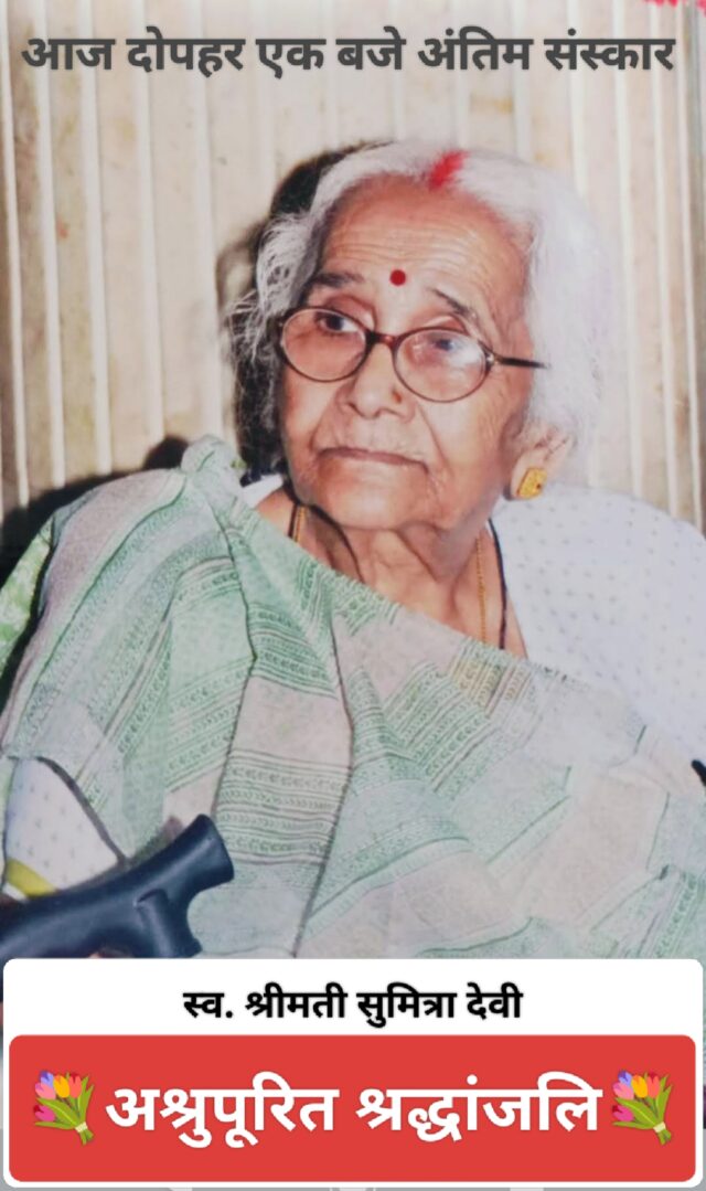 कोरबा। महाराणा प्रताप नगर तिफरा निवासी स्व. हरिद्वार सिंह की धर्मपत्नी श्रीमती सुमित्रा देवी का बुधवार 17 दिसंबर की शाम 6 बजे 90 वर्ष की आयु में दुखद निधन हो गया। वे विष्णु प्रताप सिंह, त्रिभुवन सिंह, राकेश कुमार सिंह, सरस्वती उच्चतर माध्यम विद्यालय सीएसईबी कोरबा पूर्व में भौतिक शास्त्र के व्याख्याता सतीश कुमार सिंह की मां एवं नवभारत रायपुर के कर्मी संजय सिंह की बड़ी मां हैं। उनकी अंतिम यात्रा निज निवास से यदुनंदन नगर स्थित मुक्तिधाम के लिए दोपहर 1:00 बजे निकलेगी। अंतिम संस्कार बिलासपुर स्थित स्थानीय मुक्तिधाम में किया जाएगा।