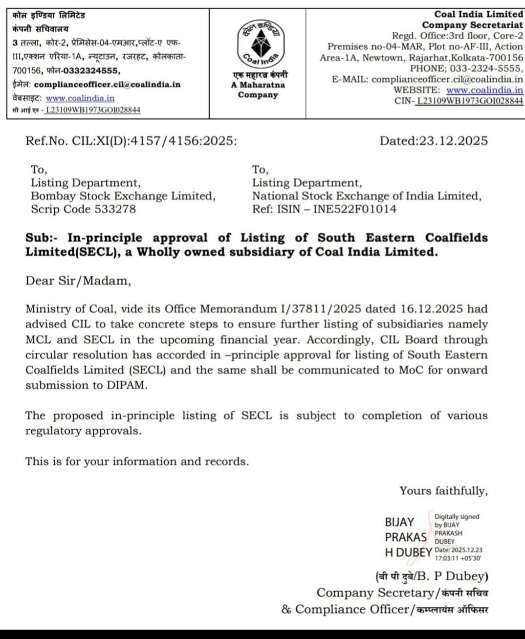 CIL के बोर्ड ऑफ डायरेक्टर्स ने सैद्धांतिक रूप से प्रदान की SECL और MCL को लिस्ट करने की स्वीकृति, शेयरों में दिखा असर