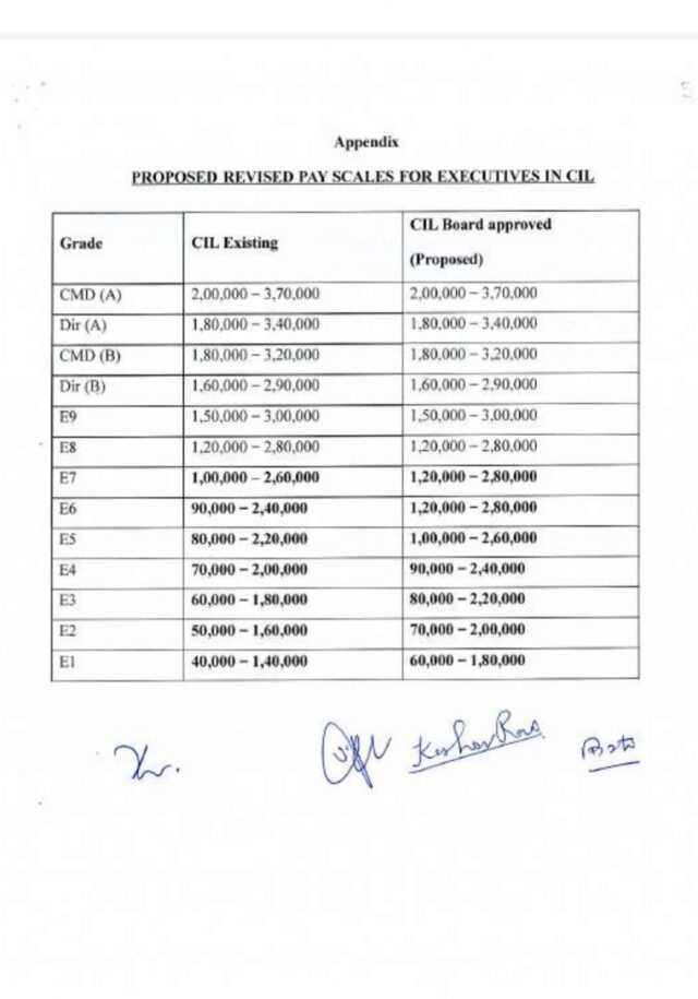 CIL एवं अनुषंगी कंपनियों में कार्यपालकों के लिए उन्नत वेतनमान के मुद्दे पर गठित समिति की रिपोर्ट जारी, यहां देखें E 1 से CMD तक प्रस्तावित संशोधित वेतनमान