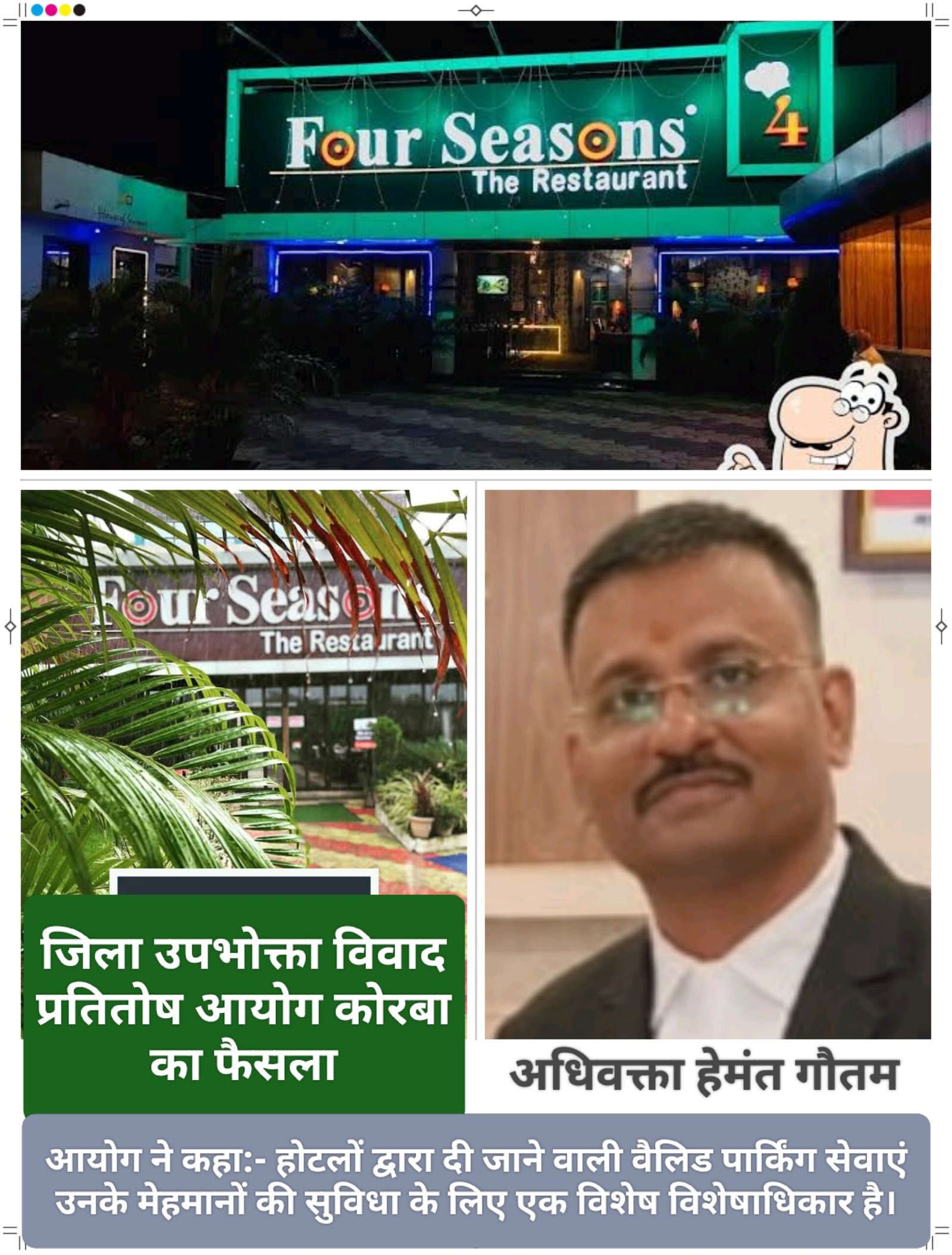 नरसिंग गंगा कालोनी, न्यू पोड़ीबहार कोरबा निवासी एवं अधिवक्ता हेमंत गौतम ने सुनालिया बाईपास रोड टीपी नगर में संचालित होटल फोर सिजन रेस्टोरेंट के विरुद्ध जिला उपभोक्ता विवाद प्रतितोष आयोग कोरबा में यह मामला दायर किया था। परिवादी श्री गौतम द्वारा उपभोक्ता संरक्षण अधिनियम 2019 की धारा 35 के तहत यह परिवाद पत्र पेश करते हुए विरोधीपक्षकार होटल संचालक हिमांशू सिन्हा के विरूद्ध सेवा में कमी का अभिकथन करते हुए क्षतिपूर्ति राशि, सहित अन्य अनुतोष दिलाए जाने हेतु परिवाद प्रस्तुत किया था।