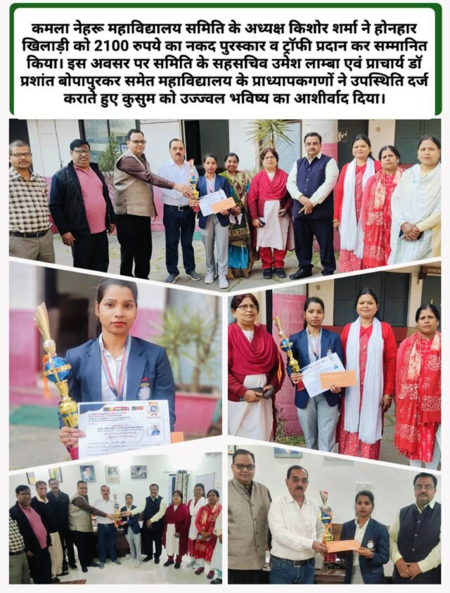 कोरबा। प्रथम साउथ एशियन गोल शॉट बॉल चैंपियनशिप में नेपाल से भारत के लिए स्वर्ण पदक लेकर आने वाली कोरबा जिले की बेटी कुसुम साहू का कमला नेहरू महाविद्यालय समिति एवं प्राध्यापकों ने सम्मान किया। समिति के अध्यक्ष किशोर शर्मा ने काॅलेज की इस होनहार छात्रा एवं अंतर्राष्ट्रीय खिलाड़ी को 2100 रुपये का नकद पुरस्कार व ट्राॅफी प्रदान कर सम्मानित किया। इस अवसर पर समिति के सहसचिव उमेश लाम्बा एवं प्राचार्य डाॅ प्रशांत बोपापुरकर समेत महाविद्यालय के प्राध्यापकगणों ने उपस्थिति दर्ज कराते हुए उज्ज्वल भविष्य का आशीर्वाद दिया।