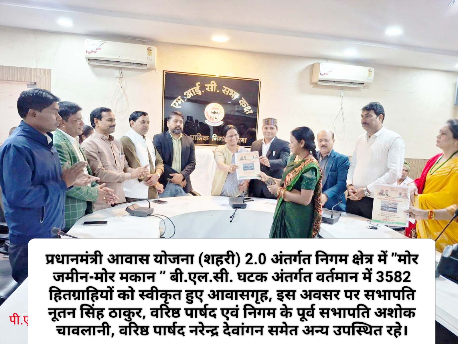 प्रधानमंत्री आवास योजना (शहरी) 2.0 अंतर्गत निगम क्षेत्र में ’’मोर जमीन-मोर मकान ’’ बी.एल.सी. घटक अंतर्गत वर्तमान में 3582 हितग्राहियों को स्वीकृत हुए आवासगृह, इस अवसर पर सभापति नूतन सिंह ठाकुर, वरिष्ठ पार्षद एवं निगम के पूर्व सभापति अशोक चावलानी, वरिष्ठ पार्षद नरेन्द्र देवांगन समेत अन्य उपस्थित रहे।