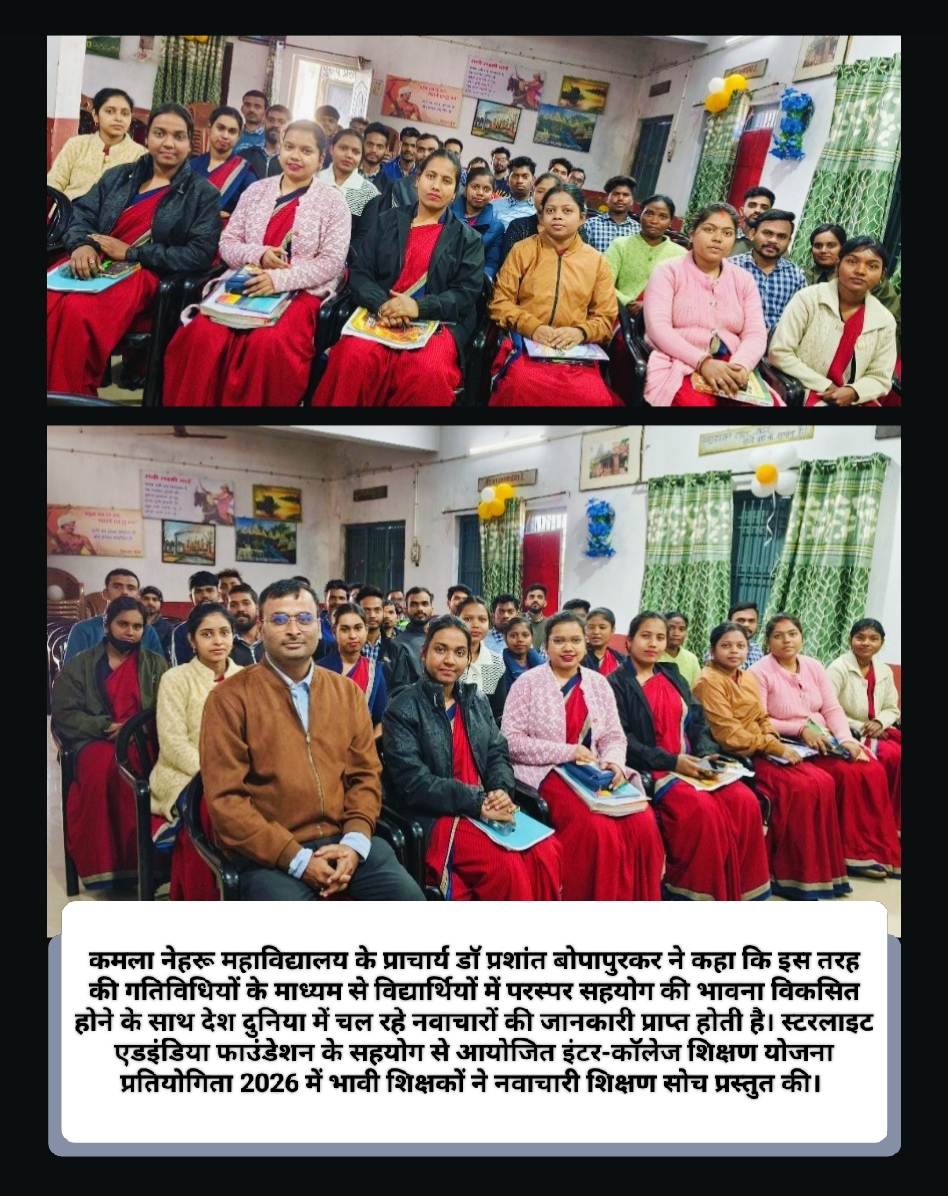 कमला नेहरू महाविद्यालय कोरबा के प्राचार्य डॉ प्रशांत बोपापुरकर के मार्गदर्शन में यह कार्यक्रम आयोजित किया गया। स्टरलाइट एडइंडिया फाउंडेशन के सहयोग से हुई इंटर-कॉलेज शिक्षण योजना प्रतियोगिता 2026 में भावी शिक्षकों ने प्रस्तुत की नवाचारी शिक्षण सोच।