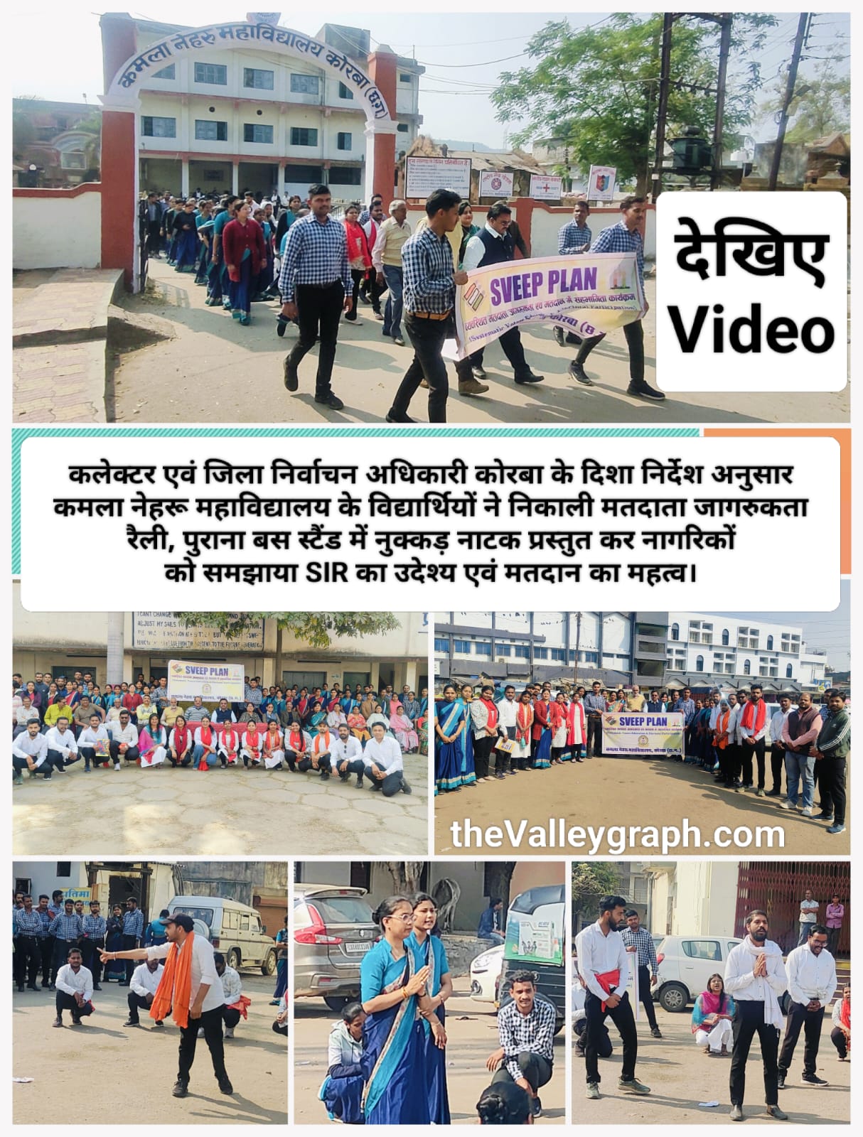 कलेक्टर एवं जिला निर्वाचन अधिकारी कोरबा कुणाल दुदावत के दिशा निर्देश के अनुसार कमला नेहरू महाविद्यालय के विद्यार्थियों ने निकाली मतदाता जागरुकता रैली, पुराना बस स्टैंड में नुक्कड़ नाटक प्रस्तुत कर नागरिकों को समझाया SIR का उदेश्य एवं महत्व।