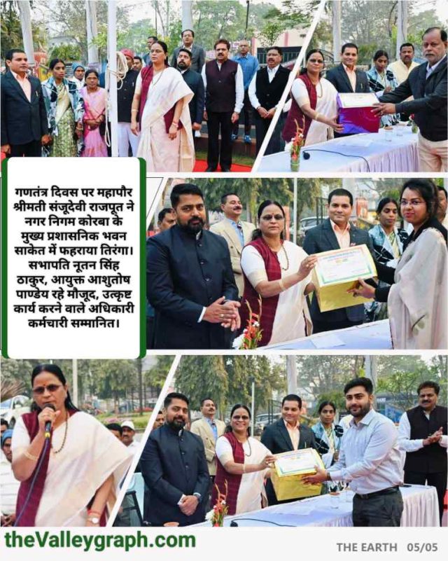 गणतंत्र दिवस पर महापौर श्रीमती संजूदेवी राजपूत ने नगर निगम कोरबा के मुख्य प्रशासनिक भवन साकेत में फहराया तिरंगा। सभापति नूतन सिंह ठाकुर, आयुक्त आशुतोष पाण्डेय रहे मौजूद, उत्कृष्ट कार्य करने वाले अधिकारी कर्मचारियों को सम्मानित किया गया।