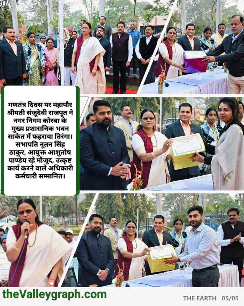 26 जनवरी गणतंत्र दिवस के पावन अवसर पर नगर पालिक निगम कोरबा के मुख्य प्रशासनिक भवन साकेत में गणतंत्र दिवस समारोह का आयोजन किया गया। आयोजन की मुख्य अतिथि महापौर श्रीमती संजूदेवी राजपूत ने इस मौके पर ध्वजारोहण किया तथा गणतंत्र दिवस की अपनी हार्दिक बधाई व शुभकामनाएं नगरवासियों को दी। इस मौके पर महापौर श्रीमती संजूदेवी राजपूत ने अपने उद्बोधन में कहा कि हमारा सौभाग्य है कि हम विश्व के सबसे बडे़ लोकतंत्र भारतीय गणराज्य के निवासी है, जहाॅं पर लोकतंत्र अपने सच्चे स्वरूप में विद्यमान है तथा हम सब इस लोकतंत्र के अभिन्न अंग हैं। उन्होने आगे कहा कि हमारे छत्तीसगढ़ में मुख्यमंत्री विष्णुदेव साय की अगुवाई में विगत 02 वर्षो में राज्य सरकार ने प्रदेश का तेजी से विकास किया तथा प्रदेश के किसान, मजदूर, श्रमिक, गरीब, महिला, युवा एवं समाज के सभी वर्ग के लोगों के कल्याण के लिए दर्जनों योजनाए संचालित की, सैकड़ों जनहितकारी निर्णय लिए, जिनके परिणाम स्वरूप प्रदेश के लाखों, करोड़ो लोग इन जनकल्याणकारी निर्णयों से लाभान्वित हुए। विगत 02 वर्ष के दौरान कोरबा नगर निगम क्षेत्र के अंतर्गत विभिन्न विकास कार्यो हेतु विविध मदों से लगभग 800 करोड़ रूपये से अधिक की राशि स्वीकृति की गई, परिणाम स्वरूप निगम क्षेत्र में विकास को नई ऊर्जा मिली तथा क्षेत्र की जनता जनार्दन की इच्छा, मांग व उनकी आवश्यकता के अनुरूप विकास को गति व दिशा दी गई। इस हेतु मैं मान. मुख्यमंत्री श्री विष्णुदेव साय जी, उपमुख्यमंत्री व नगरीय प्रशासन मंत्री श्री अरूण साव जी एवं उद्योग मंत्री श्री लखनलाल देवांगन जी के प्रति कृतज्ञता व्यक्त करती हॅू, आभार ज्ञापित करती हॅू। उन्होने निगम आयुक्त श्री आशुतोष पाण्डेय को बधाई देते हुए कहा कि उनके कुशल दिशा निर्देशन में हमारा नगर निगम कोरबा, शहर की स्वच्छता, नगर के विकास व शहर की व्यवस्थाओं को सुधारने की दिशा में बेहतर कार्य कर रहा है, मैं धन्यवाद देती हूॅं, अपने साथी पार्षदबंधुओं व बहनों का, जिनके अमूल्य सुझाव व सहयोग नगर के विकास के लिए मुझे लगातार प्राप्त हो रहे हैं। मैं साधुवाद देती हूॅं अपने अधिकारी कर्मचारियों को, जिनकी कर्तव्यनिष्ठा व परिश्रम की बदौलत हमारा नगर निगम नित नई उपलब्धियाॅं हासिल कर रहा है। उन्होने विशेष रूप से उल्लेख करते हुए कहा कि विगत कुछ माहों के दौरान शहर की स्वच्छता व साफ-सफाई व्यवस्था में ऐतिहासिक बदलाव आए हैं, हमारे नागरिकबंधुओं व माताओं बहनों में भी स्वच्छता व साफ-सफाई के प्रति जागरूकता बढ़ी है, शहर का परिदृश्य परिवर्तित हुआ है और हमारा कोरबा शहर अब बदला-बदला नजर आ रहा है। इन्हीं सबका परिणाम है कि स्वच्छ सर्वेक्षण की रैकिंग में हमारे कोरबा ने देश में 8वीं रैंकिंग हासिल कर टा